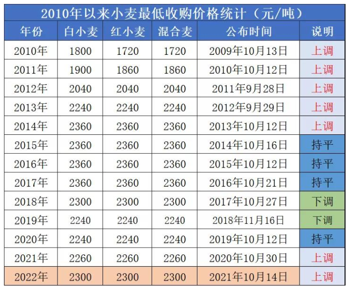 10月14日,國家發(fā)展改革委等公布2022年小麥最低收購價(jià)格的通知,2022年生產(chǎn)的小麥(三等)最低收購價(jià)為1.15元/斤,較2021年小麥最低收購價(jià)1.13元/斤提高0.02元/斤。限定收購總量為3700萬(wàn)噸,分兩批次下達,第一批數量為3330萬(wàn)噸,不分配到??;第二批數量為370萬(wàn)噸,視收購需要具體分配到省。