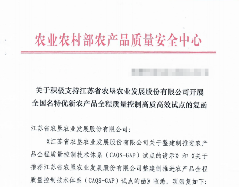 •        近日,農業(yè)農村部農產(chǎn)品質(zhì)量安全中心正式復函批復江蘇省農墾農業(yè)發(fā)展股份有限公司(簡(jiǎn)稱(chēng):蘇墾農發(fā))積極支持開(kāi)展全國名特優(yōu)新農產(chǎn)品全程質(zhì)量控制高質(zhì)高效試點(diǎn)。蘇墾農發(fā)成為全國第二家、江蘇省第一家整建制獲批推進(jìn)農產(chǎn)品全程質(zhì)量控制技術(shù)體系(CAQS-GAP)試點(diǎn)單位的企業(yè)。