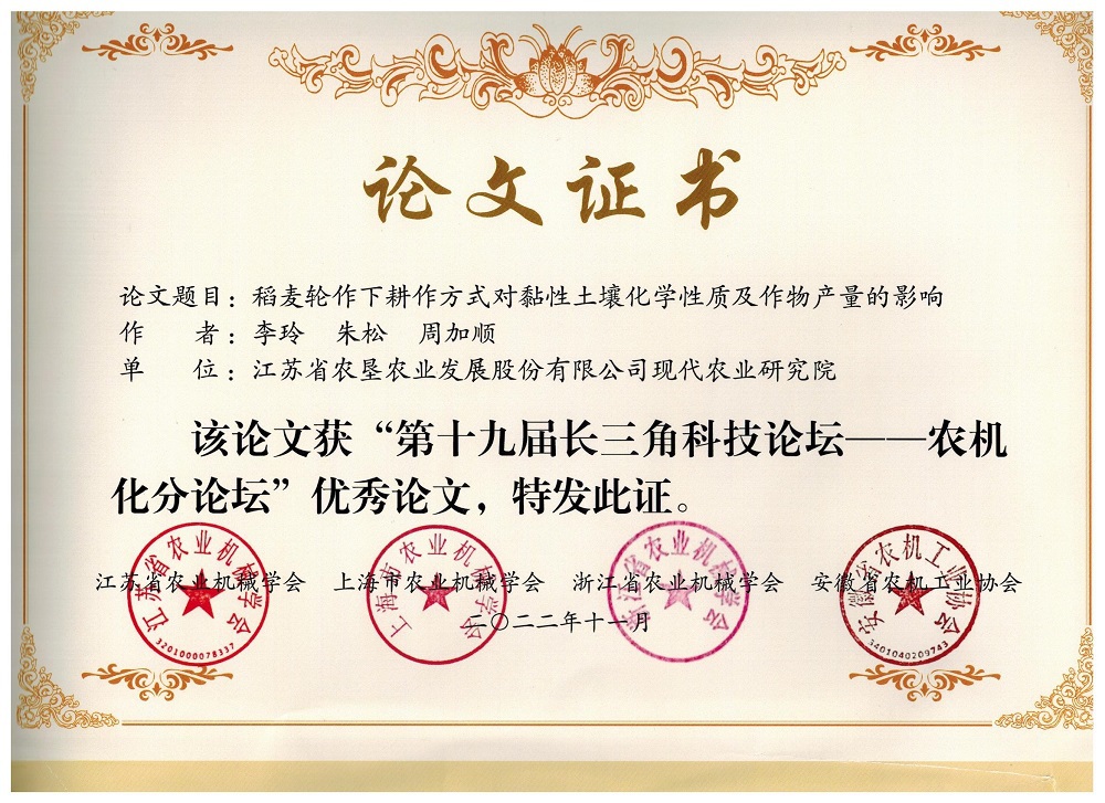 11月21日,江蘇省農業(yè)機械學(xué)會(huì )、上海農業(yè)機械學(xué)會(huì )、浙江省農業(yè)機械學(xué)會(huì )、安徽省農機工業(yè)協(xié)會(huì )發(fā)布了《關(guān)于表彰“第十九屆長(cháng)三角科技論壇-農機化分論壇”優(yōu)秀論文的決定》(蘇農機學(xué)會(huì )〔2022〕12號),江蘇省農墾農業(yè)發(fā)展股份有限公司現代農業(yè)研究院為第一單位的兩篇科技論文 “稻麥輪作下耕作方式對黏性土壤化學(xué)性質(zhì)及作物產(chǎn)量的影響” “秸稈還田下濱海黏質(zhì)鹽土肥力演變研究”獲得“第十九屆長(cháng)三角科技論壇-農機化分論壇”優(yōu)秀論文獎。