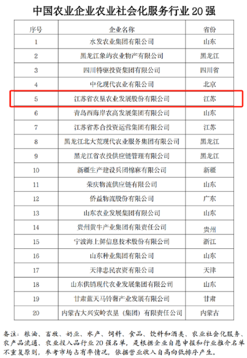 近日,農民日報社發(fā)布了2023中國農業(yè)企業(yè)500強名單,蘇墾農發(fā)再次成功入選,位列第99位,較去年提升22位;此次活動(dòng)還評選了2023中國農業(yè)企業(yè)行業(yè)20強名單,蘇墾農發(fā)再次入選農業(yè)社會(huì )化服務(wù)行業(yè)20強,位列第5位,較去年上升1位。再度入選中國農業(yè)企業(yè)500強、中國農業(yè)企業(yè)行業(yè)20強,標志著(zhù)蘇墾農發(fā)行業(yè)地位得到進(jìn)一步認可和鞏固,競爭優(yōu)勢得到進(jìn)一步凸顯和提升。
