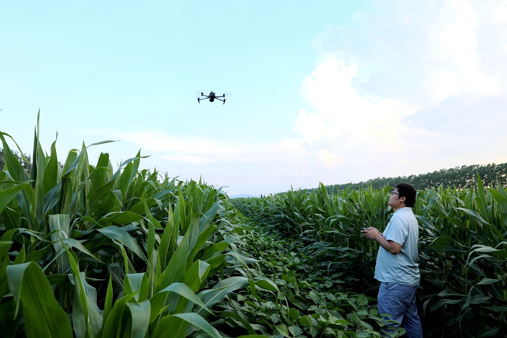 來(lái)到西洋生產(chǎn)區51大隊,一壟壟綠油油的大豆玉米長(cháng)勢喜人。在大豆玉米高標準農田邊,農業(yè)中心技術(shù)員程盤(pán)龍正熟練地操控著(zhù)無(wú)人機進(jìn)行巡田檢查。隨著(zhù)無(wú)人機在頭頂飛過(guò),農田里的情況便能直接顯示在操作盤(pán)屏幕上,作物長(cháng)勢、病蟲(chóng)害發(fā)生情況等均能進(jìn)行實(shí)時(shí)查看?!耙郧吧a(chǎn)檢查,一天一組只能抽檢幾個(gè)大隊,且只能對共性問(wèn)題進(jìn)行統一指導?,F在有了無(wú)人機的幫忙,半天時(shí)間就能將所管轄區域的田塊全部巡查結束,還可以深入田塊的各個(gè)角落,對個(gè)別田塊存在的生產(chǎn)問(wèn)題,進(jìn)行有針對性的技術(shù)指導,無(wú)人機巡田檢查范圍更廣,工作效率更高,查看生產(chǎn)也更仔細?!背瘫P(pán)龍一邊演示一邊介紹。