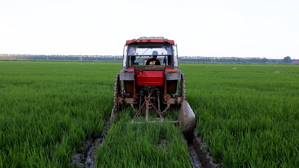 清晨五點(diǎn),天剛蒙蒙亮,海南生產(chǎn)區43大隊水稻田里,工作人員已經(jīng)開(kāi)始忙碌起來(lái)。只見(jiàn)在碧綠茂盛的稻田中,農機駕駛員正進(jìn)行水稻豐產(chǎn)溝壓溝作業(yè),伴隨著(zhù)機器陣陣轟鳴聲,不一會(huì )兒,一條條整齊筆直的豐產(chǎn)溝就赫然呈現在眼前?!敖ê盟矩S產(chǎn)溝是解決排水降澇、實(shí)現高產(chǎn)穩產(chǎn)的關(guān)鍵性生產(chǎn)措施,有了兩臺豐產(chǎn)溝壓溝機的助力,海南生產(chǎn)區4750畝水稻,5天就可以全部完成建溝工作,科技機械的加入,既解決了人工少、地塊多的問(wèn)題,又能達到整齊度高、深淺一致的效果,為后期烤田管理、排水通暢打好基礎,真正實(shí)現一舉多得?!焙D仙a(chǎn)區技術(shù)員孫正說(shuō)。